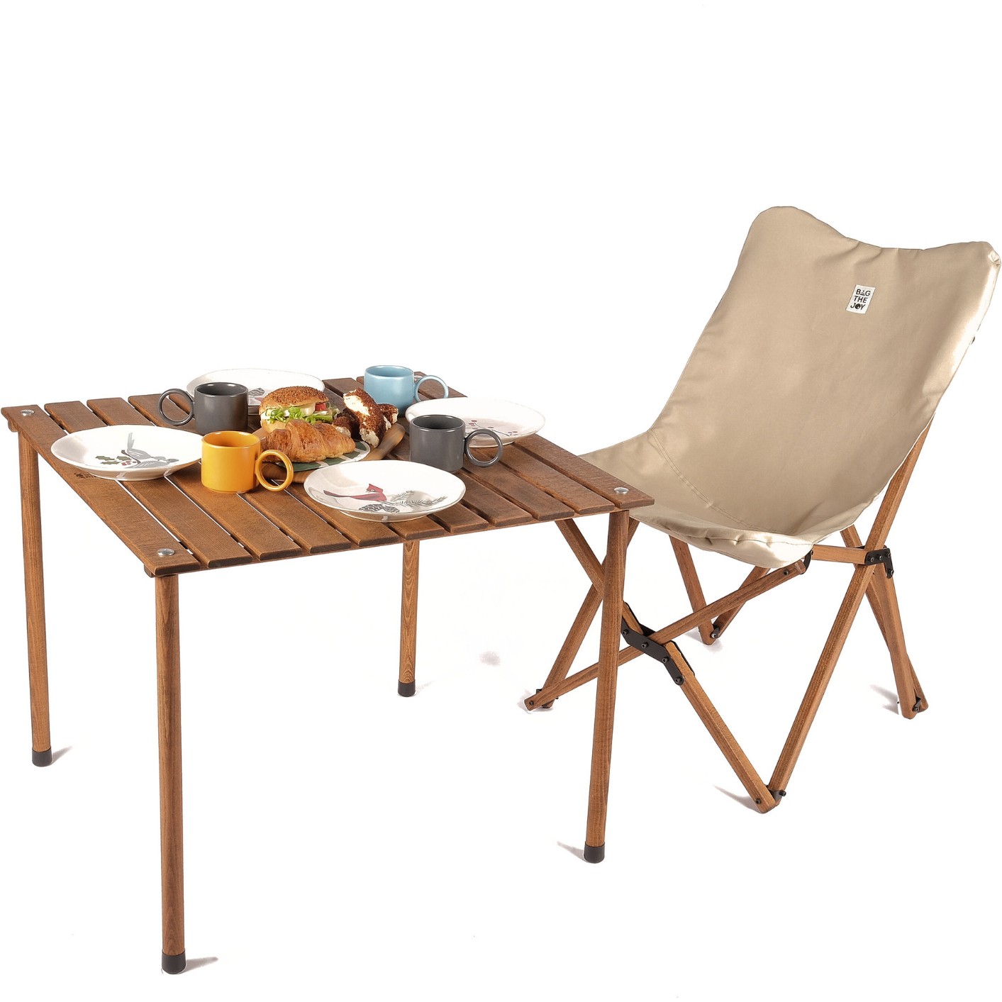 BAG THE JOY 70*70*55cm AHŞAP RULO KATLANIR KAHVERENGİ KAMP & PİKNİK MASASI + 2 ADET KAHVERENGİ AHŞAP KATLANIR KAMP SANDALYESİ – BEJ KILIF