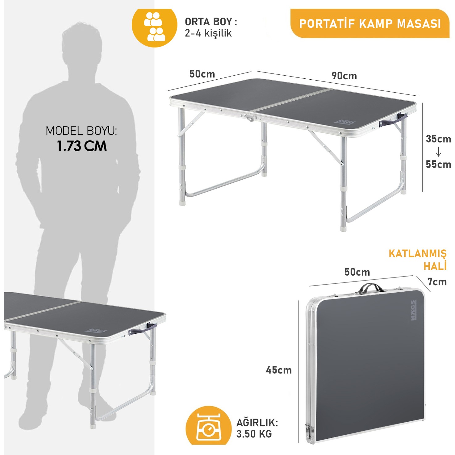 Haegs Portatif Kamp Masası, 2 Yükseklik Ayarlı, Katlanır Alüminyum Piknik Masası 90X50 – Antrasit