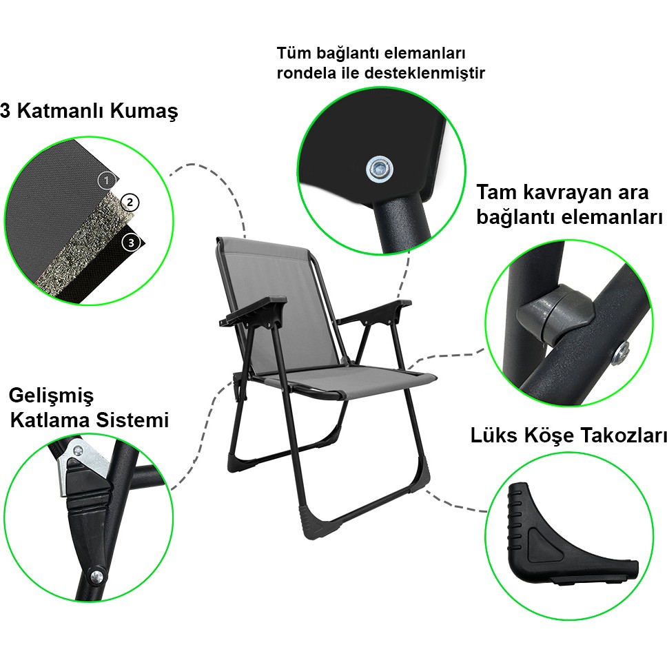 Moniev 2 Adet Kamp Sandalyesi Katlanır Piknik Sandalye Oval Bardaklıklı Gri
