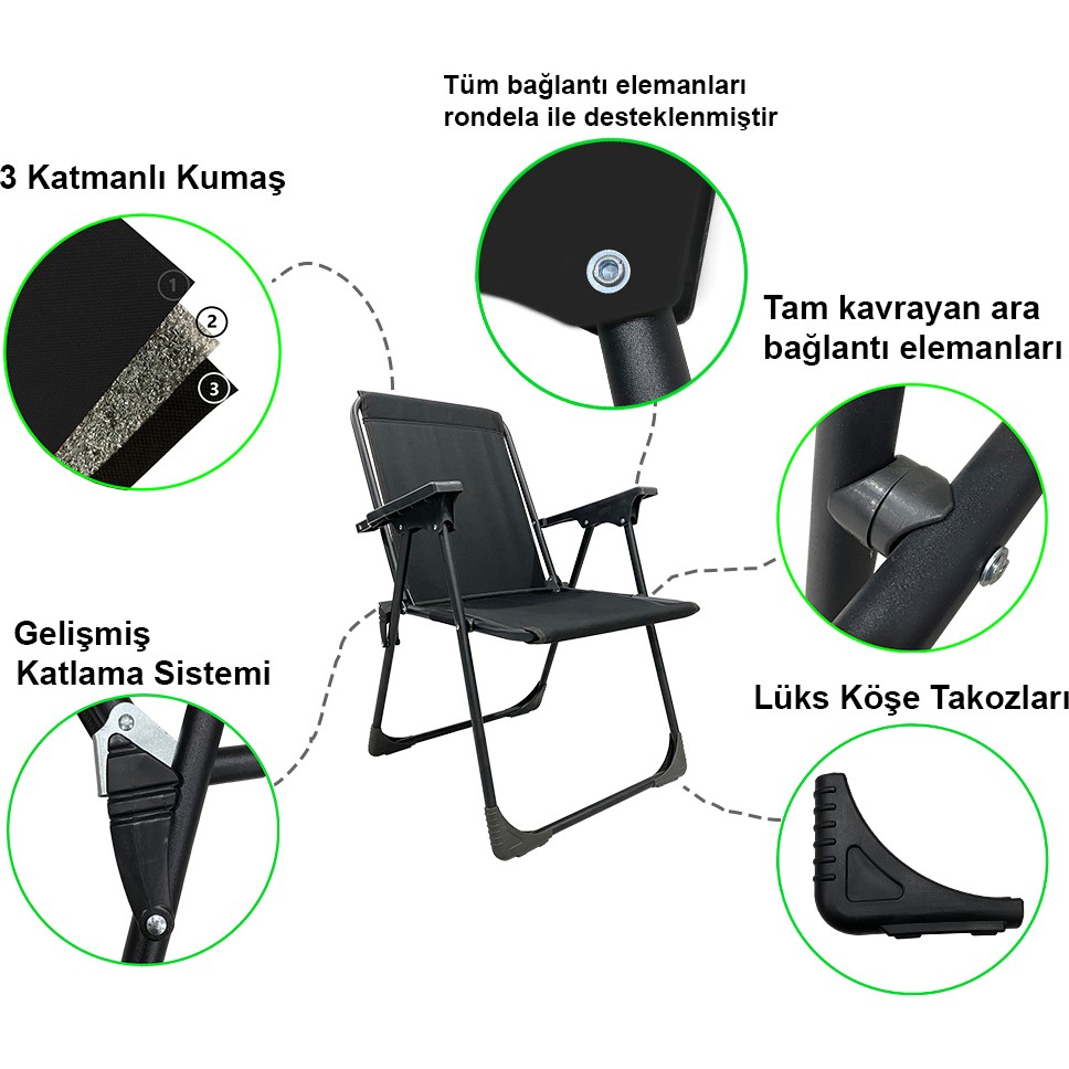 Moniev 2 Adet Kamp Sandalyesi Katlanır Piknik Sandalye Oval Bardaklıklı Siyah