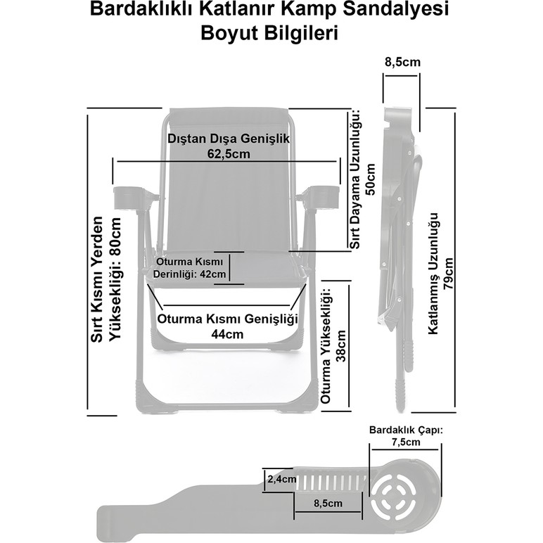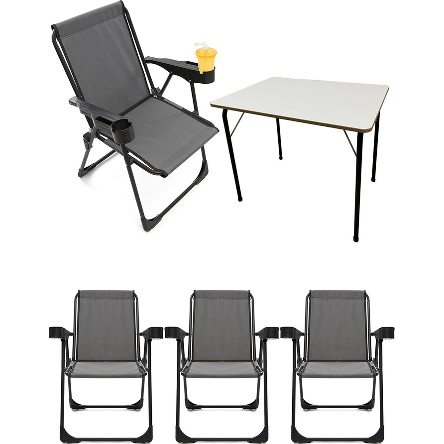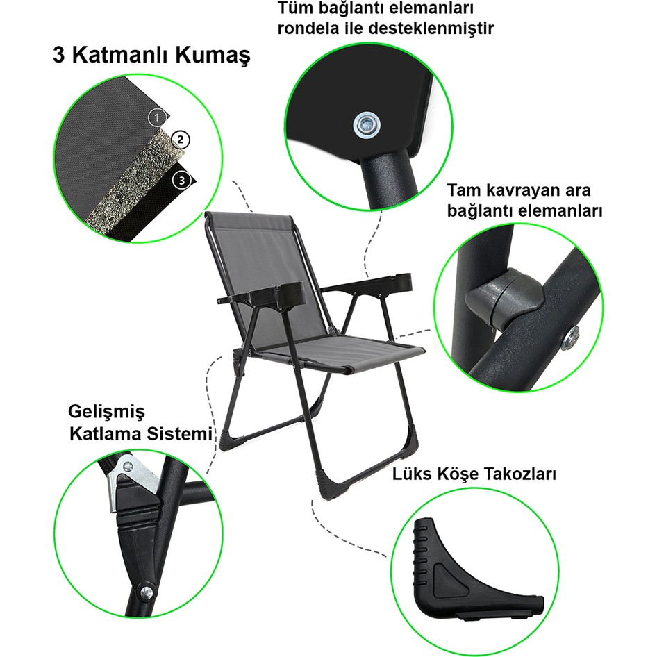 Moniev 4 Adet Kamp Sandalyesi Bardaklıklı Lüks Piknik Sandalye Gri + Katlanır Mdf Masa