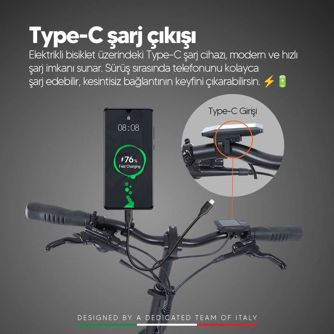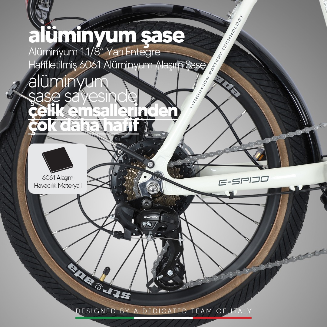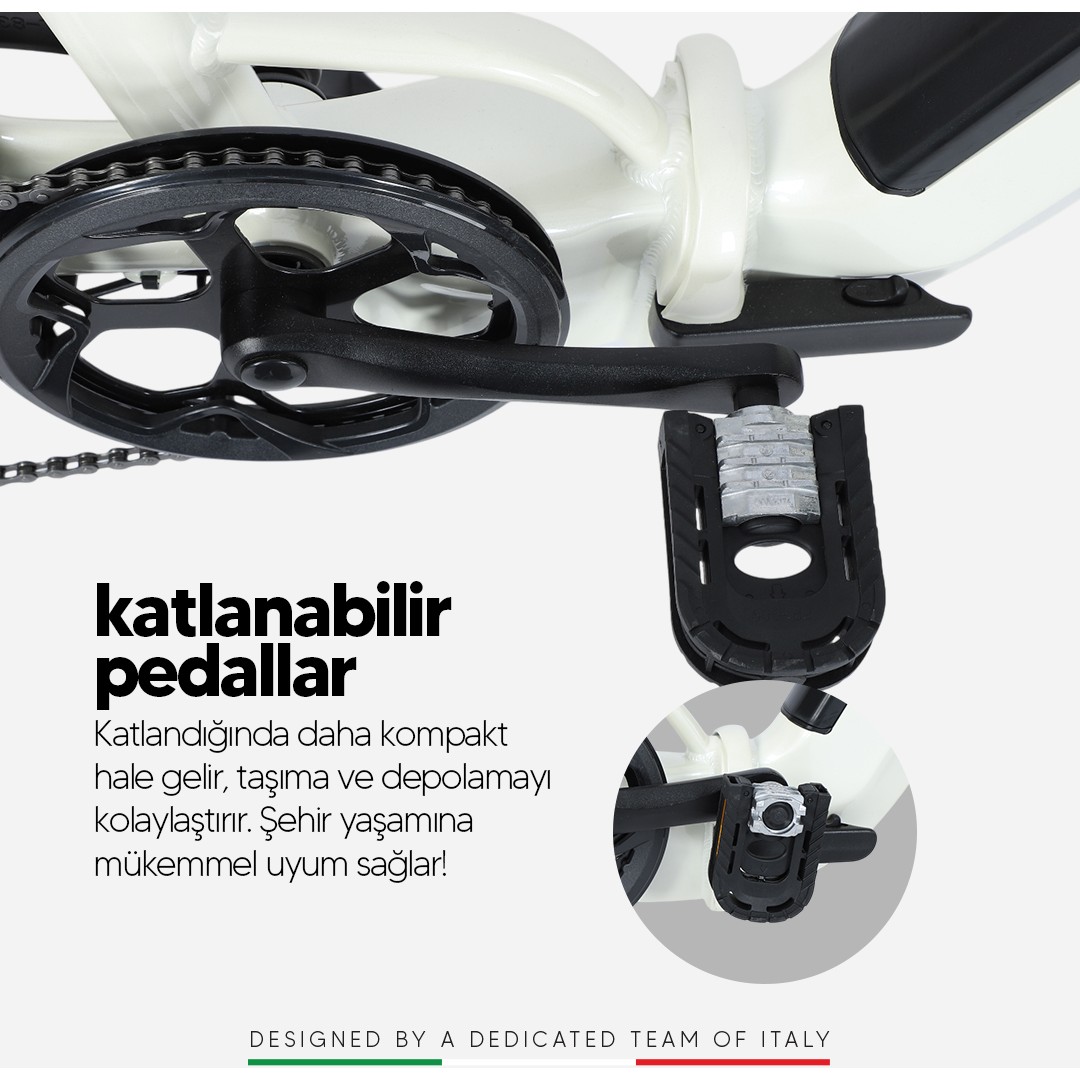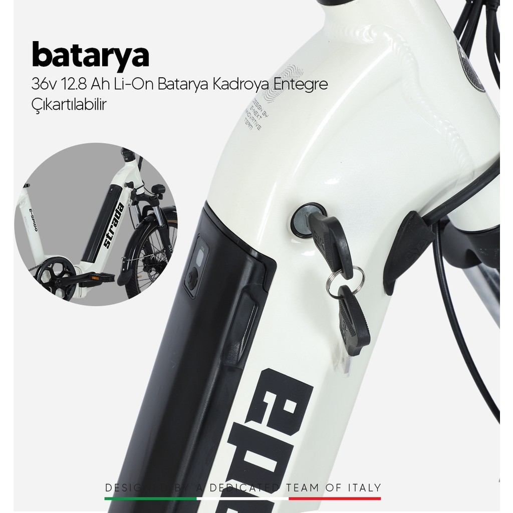 Ek Özellikler: Strada Aliminyum Gidon –Strada Ayarlı Gidon Boğazı-Strada Aliminyum Katlanır Sele Borusu- Katlanabilir Pedallar-Ön-Arka Led Aydınlatma-Kadroya Gizli Kablo Tesisatı-Arka Alüminyum Bagaj-Stop Senderlü Fren Kolları-Neco Rulmanlı Orda Göbek-Neco Furç Takımı