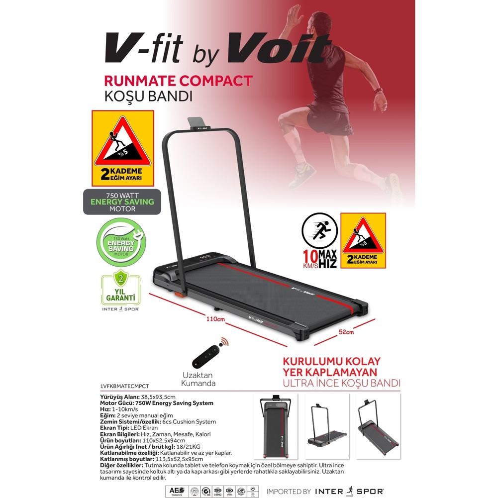 Voit Vfit By Runmate Compact Koşu Bandı Manuel Eğim Ayarlı Katlanabilir Uzaktan Kumandalı 10KM Hız