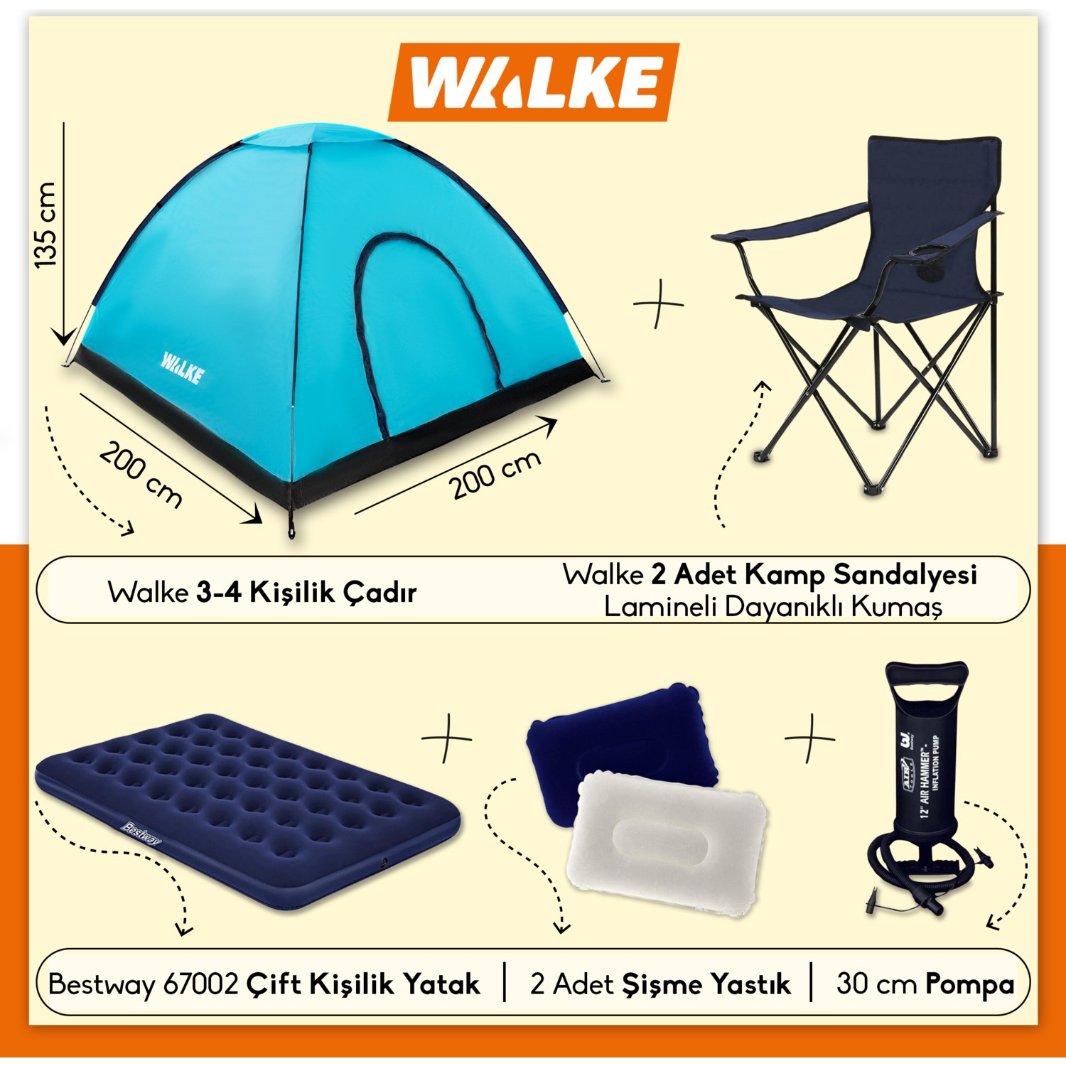 Walke Lüks Kamp Seti 4 Kişilik Çadır+ Çift Kişilik Yatak+ 2 Sandalye + Pompa+ 2 Yastık
